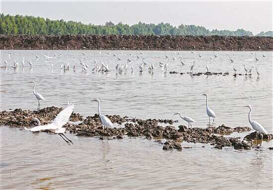 ■近日,广东天气持续温暖,在江门台山赤溪镇黄茅海滩涂湿地,大白鹭成群结队在浅滩觅食、休憩,成为冬日里一道美丽的风景线。新华社发