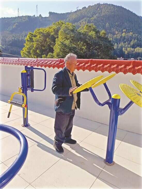 ▲老人在户外休闲健身区锻炼。