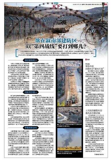 12月8日叙利亚局势剧变后,以色列趁机在叙利亚开辟“第四条战线”,持续轰炸军事目标,试图给这个老对手“去军事化”。同时,以色列占领戈兰高地缓冲区,还在毗邻地区布设阵地,并把目光投向叙利亚南部甚至东部。