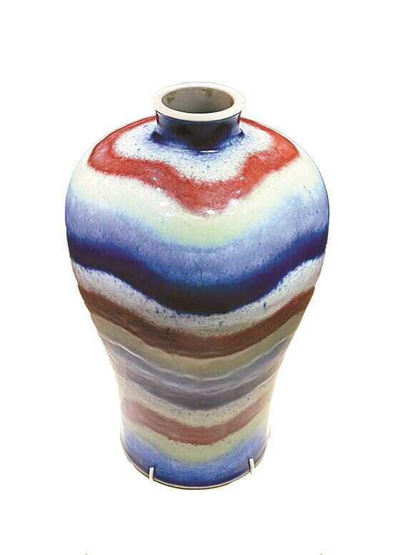 特别值得注意的还有在最后一个部分呈现的一件清雍正景德镇窑五色釉梅瓶,瓶身上,以蓝、白、红、青、天蓝五色釉,构建了一道道环形彩带。“这种效果是有意为之,并不是窑变产生。这几种窑炉温度和气氛要求不同的釉色,被施于一体,且成色良好,相当难得,可见当时烧瓷技艺的高超。”
