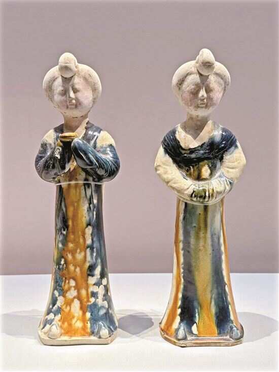 ■唐,三彩女侍俑,1992年河南巩义北窑湾M3出土。其中一位双手捧盒状物。