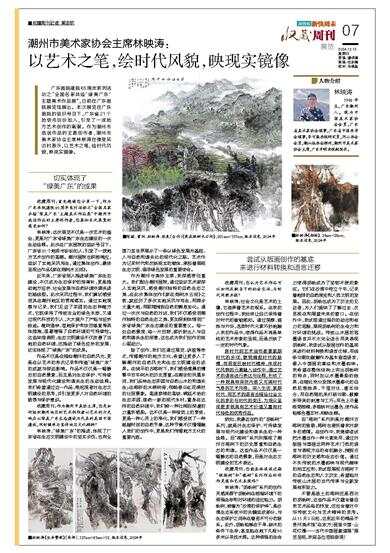 广东画院建院65周年系列活动之“全国名家共绘‘绿美广东’主题美术作品展”,日前在广东画院展览馆展出。本次展览在广东画院的组织号召下,广东省21个地级市纷纷加入,引发了一波地方艺术创作的高潮。作为潮州市选送作品的主要创作者,潮州市美术家协会主席林映涛在接受采访时表示,以艺术之笔,绘时代风貌,映现实镜像。