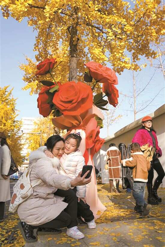 近日,成都街头银杏迎来最佳观赏期。在成都高新区肖家河街道兴蓉社区兴蓉街,居民和志愿者们一起,为路边30多棵银杏树穿上了“毛衣”,缤纷的色彩为冬日带来温暖,吸引了不少市民前来游玩拍照。