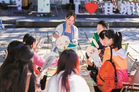 在扎染体验区,大家跟着老师一起感受捆扎、浸染的奇妙变化。很快,各有特色的成品展现在眼前,扎染从抽象的文化符号变成情感连接。