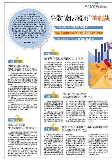 今年以来,证监会对操纵市场重拳出击。近日,证监会公布多则涉及个人操纵股票行为的行政处罚书,包括年内处罚金额最高共计3.35亿元的“85后”牛散刘洪涛和“90后”牛散娄阁;操纵股票倒亏2亿元被罚200万元的65岁深圳牛散王志恒;控制48个账户操纵23只股票被罚没近3500万元的32岁朱泽宇;内幕交易日播时尚被罚没约2800万元的夏成斌;使用118个证券账户合谋操纵朗源股份三人被罚没2.24亿元等。据公开数据统计,今年以来,证监会和地方证监局对操纵市场行为合计罚没金额近24亿元。在市场禁入处罚中,还出现了身份类禁入、交易类禁入并用的罚单。