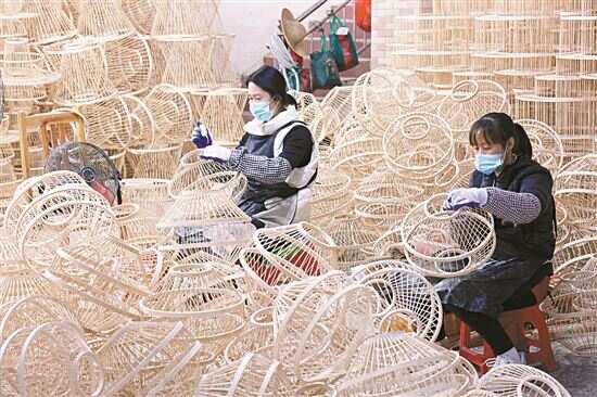 ■在禾云镇旅游驿站“沙河鸟笼”手工艺体验馆里,几名农村妇女正熟练地编制鸟笼灯饰。
