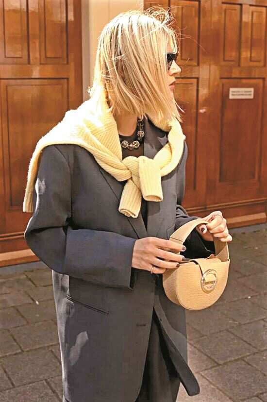 深色造型搭配中加入奶油黄色,让整体的穿搭形象充满无限柔和感。