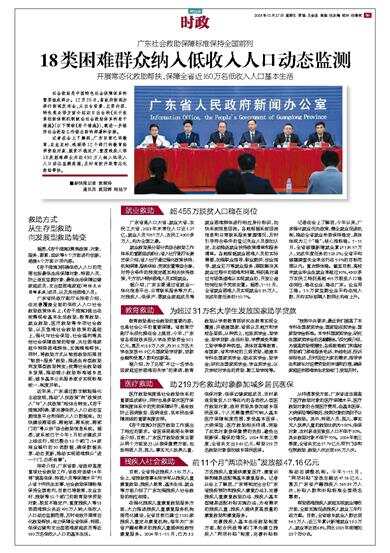 陈奇介绍,广东省委、省政府高度重视社会救助工作,省政府连续14年将“提高低保、特困人员等保障水平”列入省十件民生实事,社会救助保障标准保持全国前列,目前已将教育、农业农村、残联等12个部门的教育助学资助对象、脱贫不稳定户、重度残疾人等18类困难群众共近490万人纳入低收入人口动态监测范围,及时有效开展常态化救助帮扶,有力保障全省低保、特困、低保边缘和支出型困难家庭成员等近160万名低收入人口的基本生活。