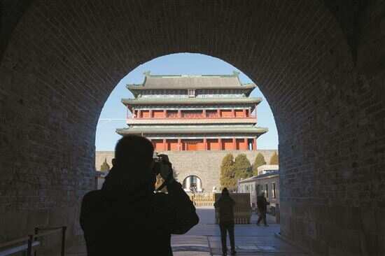 ■12月26日,参观者在正阳门箭楼下拍摄正阳门城楼。新华社发