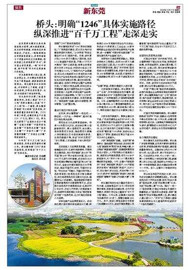 桥头镇制定形成“1246”具体实施路径。“1”指典型村建设,即以田头角村创建省典型村为契机,“以点带面”带动全镇各村(社区)提质升级。目前,该村累计投入5000多万元整治人居环境,完成3.1公里道路升级改造,开展2.9万平方米集体厂房外立面改造,培育出东莞首家北交所上市企业,村股东分红近三年平均增长15.4%。“2”指现代化产业园建设,即以总占地面积4500多亩的东太湖现代化产业体系和东深公路现代化产业体系为经济发展主引擎,通过空间拓展、园区建设、招商引资带动全镇产业转型升级。“4”指四大特色品牌,即结合桥头资源禀赋,重点打造荷花生态文化品牌、名贤故里人文品牌、环保包装产业品牌、东深供水文旅品牌等。“6”指“六大专项”行动,包括绿美乡村建设、农房风貌提升、“美丽庭院”创建、城乡环境管理、停车管理、“三线”整治等。