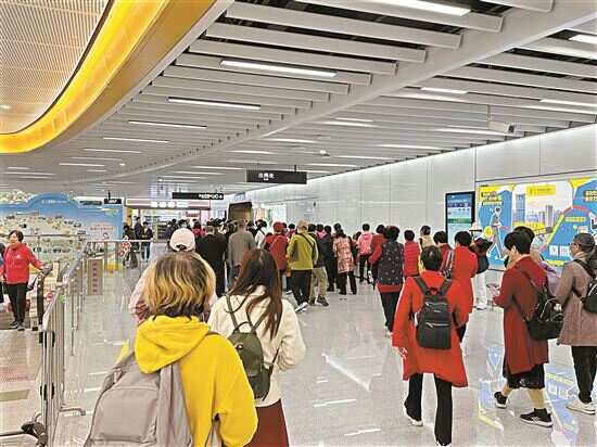 在早高峰的搭乘中,记者发现最大的亮点在云台花园站。列车车门一打开,下车的都是成群结队的老年乘客。不少老阿姨们还特意穿上了方便“出片”的红色衣服,站厅层的各个打卡点都有老年乘客拍照留念的身影。最靠近云台花园的C出口,等候出站的老年乘客排起了长龙。