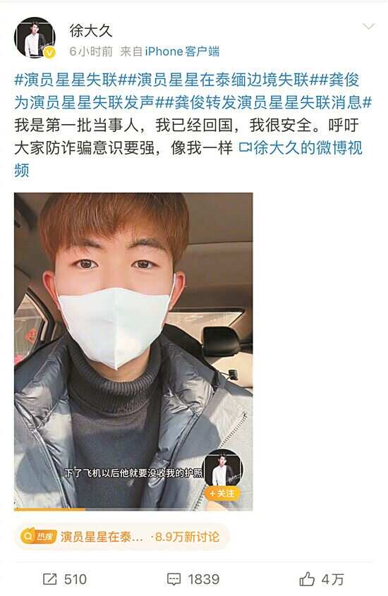 演员徐大久称,自己刚从人贩子手中逃出。记者联系上该演员徐大久,他表示自己已经回国。