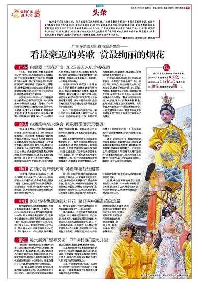 农历蛇年的大年初一,广州将继续在白鹅潭举办春节烟花汇演,为大家带来45分钟的视觉盛宴。马曙说:“今年的烟花汇演将以白鹅潭大湾区艺术中心为背景,设置了4个主题篇章,烟花品类更新、数量更多、画面更大,结合珠水鹅潭一江两岸城市景观,融入了2025架无人机表演以及灯光秀、视频投影等内容。”同时,配套推出“美食烟花航班”,将看烟花、游珠江、品美食融入一张船票,一次行程多种体验。