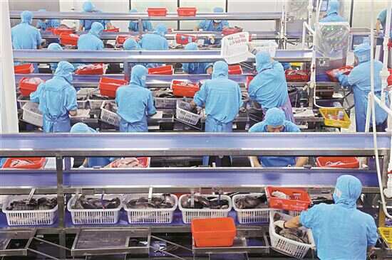 ■2024年投产的广东双洋食品科技有限公司带动了大量劳动力就业,图为工人对收购来的罗非鱼进行切片、分装。