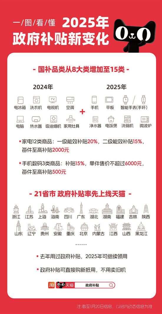 另据天猫透露,除了手机数码外,2025年的政府补贴再度加码,补贴品类从8大类(冰箱、洗衣机、电视、空调、电脑、热水器、家用灶具、吸油烟机)增加到12大类,新增(微波炉、净水器、洗碗机、电饭煲)4类家电。