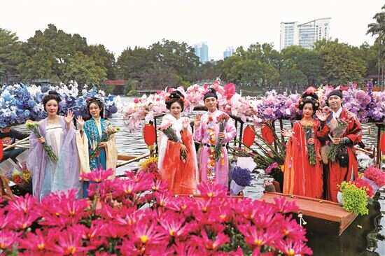 一艘艘精心打造的特色花船,载着多位身穿汉服的花仙子在湖面巡游,各种年花琳琅满目,重现昔日水上花市盛景。