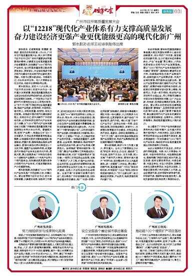 孙志洋强调,要牢牢把握国家建设粤港澳大湾区和国际消费中心城市的战略要求,充分用好广州优势,激发潜在的创新优势,全力打造实体经济最有奔头、产业“含金量”勇立潮头、人民生活更有甜头的现代化产业发展高地。要以“12218”现代化产业体系挺起现代化建设“硬脊梁”,瞄准细分赛道和主攻方向,加速推动特色优势产业转型升级、战略性新兴产业积聚成势、未来产业培优育强、现代服务业出新出彩。要以产业版营商环境打造现代化产业“强磁场”,统筹好有效市场和有为政府,在政策支持和要素市场化改革上精准、持续用力,引进一批引领性、标志性产业项目和平台型企业,用心用情用功解决市场主体的急难愁盼问题,让广大企业家、科学家、投资家在穗更好发展、更快成功。要以排头兵的使命担当奏响高质量发展“最强音”,各级领导要当好深化改革行动派,各部门要勇于解放思想、拿出建设现代化产业体系的真招实招,各区要因地制宜、各展所长,为拼经济稳增长、推动高质量发展注入强大动力。
