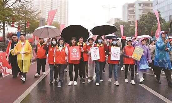 江门福彩组织中心干部职工和蓬江区、江海区部分福彩销售人员组成福彩健步方阵,并发动热心彩民一同参加活动。