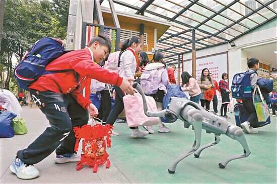 ■荔湾区华侨小学汇龙学校开学第一天,AI机器狗在校门口迎接学生。