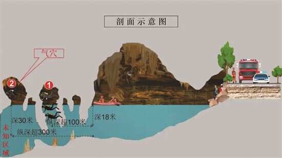 据了解,由于洞内宽度大,水深超15米,救援队决定采用5个200米的大线轮从洞口往水下布置引导绳,以便救援人员在洞内来回搜寻。“由于被困人员的具体位置不是很清晰,只能隐隐约约听到敲击岩壁的声音,我们就沿着这个大致方向前往搜寻。”百色市公安局特警支队水上勤务救援大队队员许世德说。