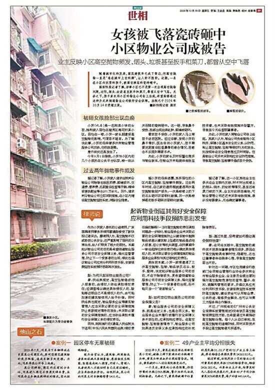 新快报讯 记者高京 毛毛雨报道 去年10月18日,新快报在《女孩被飞落瓷砖砸中,小区物业公司成被告》一文中(左图),曾报道家住广州市越秀区的七岁女童小芳(化名)在小区内被瓷砖砸中的事情,为此孩子家长将小区物业告上法庭。记者从女孩家属处获悉,该案于2月26日下午,在广州市越秀区人民法院开庭,庭审持续2小时。