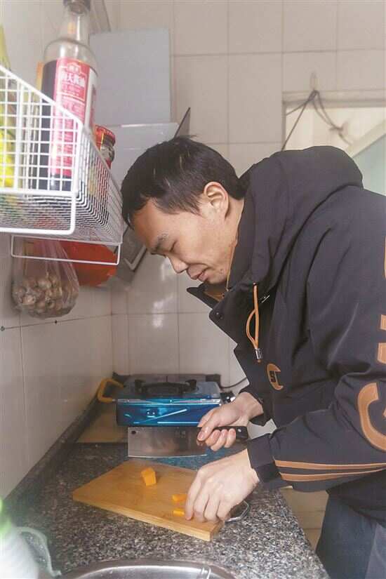 李永租住在12楼,房屋格局与住在8楼的丹丹一样——两间卧室、一间客厅,厨房在阳台的小隔间里。“孩子移植前后都有特殊的饮食要求,所以找房子必须要有厨房。”他从柜子里拿出一块小菜板,搭在水池边,很娴熟地将洗好的南瓜切成小粒,“小源肠胃功能不太好,切小容易消化”。