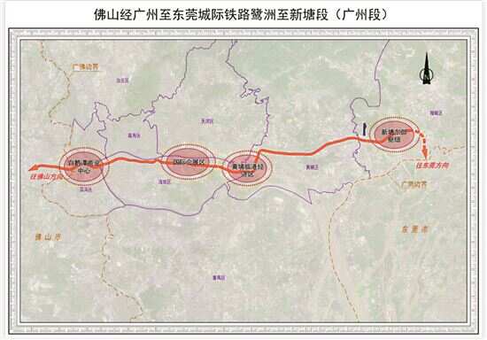 根据公示,佛山经广州至东莞城际铁路(下称“佛穗莞城际”)鹭洲至新塘段(广州段)自广佛边界经荔湾区、海珠区、黄埔区、增城区,设车辆段一座,主变电所两座。线路经过广州市荔湾区茶滘街道、石围塘街道、花地街道、冲口街道;海珠区南华西街道、龙凤街道、海幢街道、素社街道、滨江街道、新港街道、赤岗街道、琶洲街道;黄埔区长洲街道、鱼珠街道、大沙街道、文冲街道、红山街道、云埔街道;增城区新塘镇、永宁街道,将覆盖白鹅潭商业中心、国际会展区、黄埔临港经济区、新塘东部枢纽。
