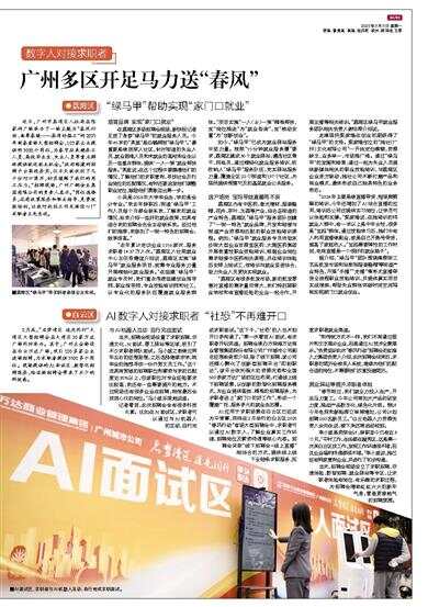 AI应用于求职场景在白云区已经成为平常事,同样在2月举行的白云区2025“春风行动”首场大型招聘会中,求职者可以通过AI数字人,了解企业真实工作环境、招聘岗位及薪资待遇等核心内容。招聘会采取“线下招聘会+线上直播”相结合的方式,提供线上线下全链条求职服务,拓宽求职者就业渠道。