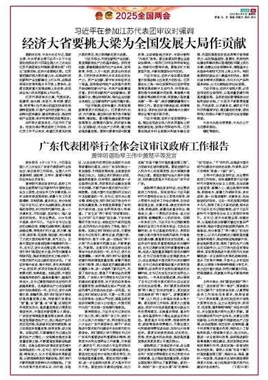 黄坤明指出,习近平总书记亲切关怀广东人民,倾心指导广东工作,党的十八大以来六次亲临广东,两次参加全国人大会议广东代表团审议,赋予广东在推进中国式现代化建设中走在前列的光荣使命。我们要深入学习贯彻总书记对广东系列重要讲话和重要指示精神,按照党中央和全国两会工作部署,只争朝夕、真抓实干,努力完成今年各项目标任务,不断开创广东现代化建设新局面。要坚定扛起经济大省挑大梁的责任,加快推进高质量发展。要坚定用好关键一招,进一步全面深化改革、扩大高水平对外开放。要坚定补齐最突出短板,加力实施“百县千镇万村高质量发展工程”,力促城乡区域协调发展。要坚定践行以人民为中心的发展思想,加大保障改善民生力度。要坚定维护社会大局平安稳定,加快建设更高水平的法治广东平安广东。