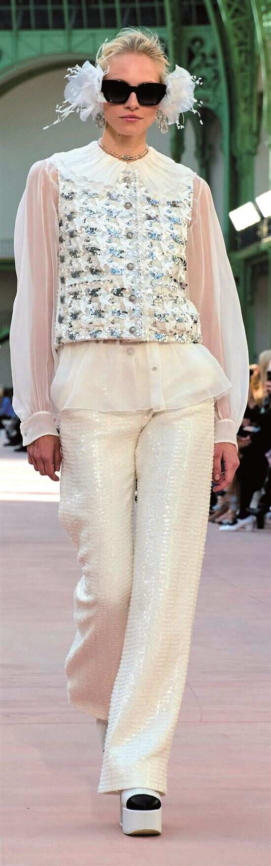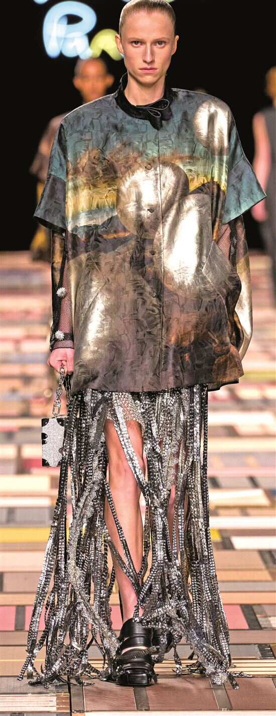 更多材质碰撞也同时令传统材质焕发新生,如在经典斜纹软呢套装中融入亮片与刺绣或以大面积水钻、钉珠作画,让日常的造型穿搭也可以像秀场一般“繁简结合”,用简约廓形的经典单品搭配肌理丰富的时装,让经典版型拥有令人眼前一亮的创新视觉效果。