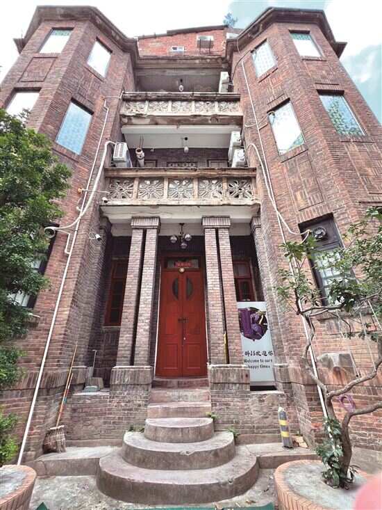 同样建于民国时期,是一栋三层高的红砖楼房,整体设计放到今天看依旧很经典,既西化,又带传统中式文化中讲究的“对称”。