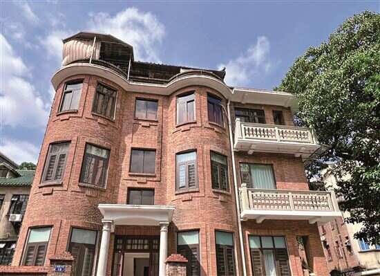 典型的红砖混合结构三层小楼,民国时期中西结合式建筑,建于1935年,坐北朝南,曲尺形平面。