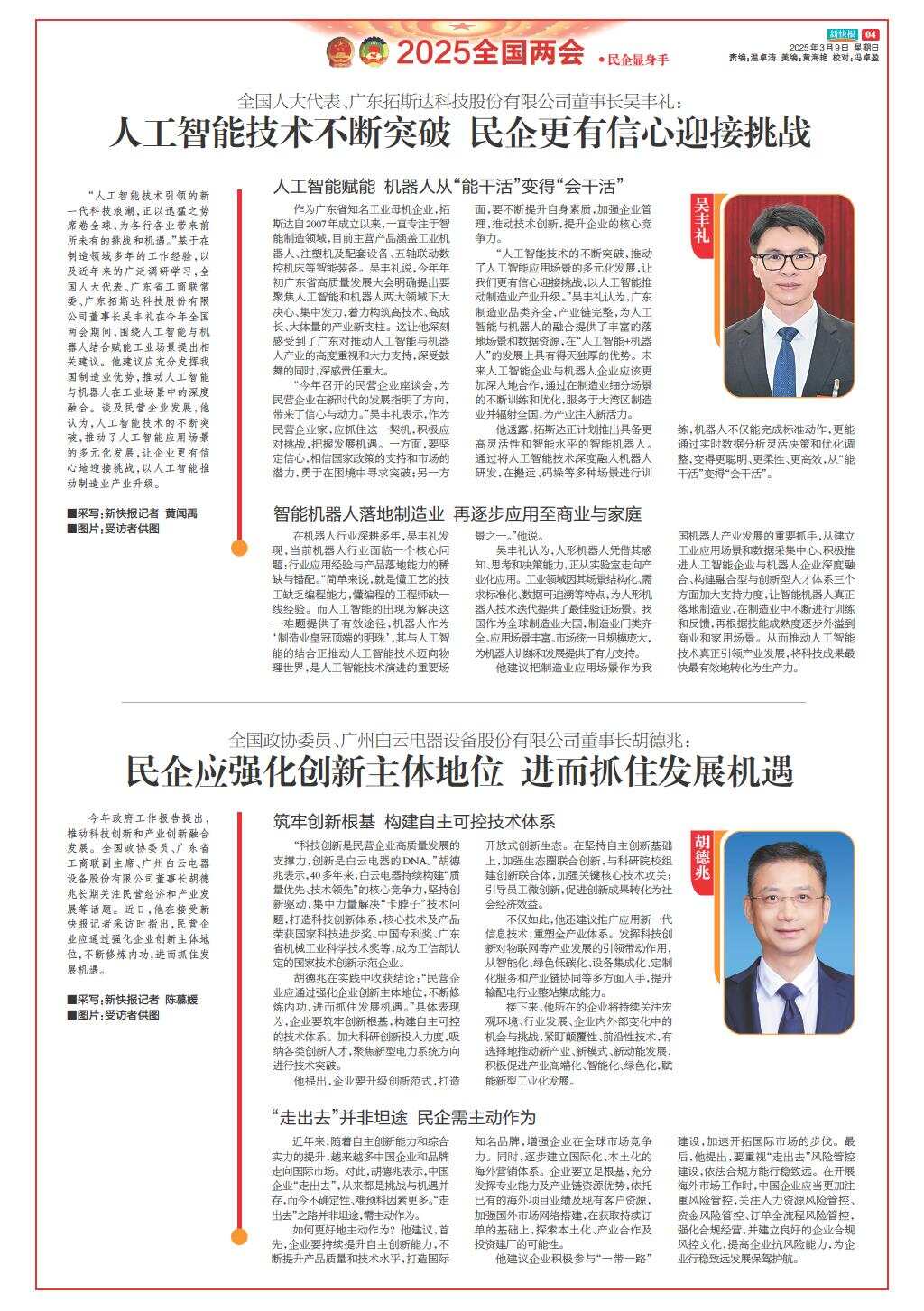 全国人大代表、广东拓斯达科技股份有限公司董事长吴丰礼:人工智能技术不断突破 民企更有信心迎接挑战