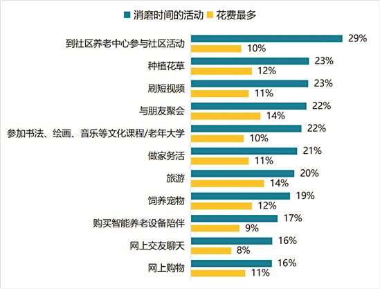 报告显示,广州市老年人当感到陪伴缺失时,会寻找各种活动消磨时间,如:到社区养老中心参与社区活动(占比29%),种植花草(占比23%),刷短视频(占比23%),与朋友聚会(占比22%),参加书法、绘画、音乐等文化课程/老年大学(占比22%),做家务活(占比21%)及旅游(占比20%)等。其中,花钱最多的前七项分别是旅游、与朋友聚会(各占14%),饲养宠物和种植花草(各占12%),刷短视频,做家务活及网上购物(各占11%)。