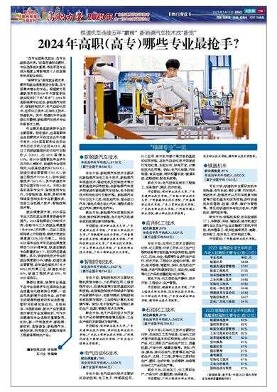 “绿牌专业”是指就业落实率、薪资和就业满意度综合较高,且市场需求增长的专业。根据麦可思最新发布的《2024年中国高职生就业报告》(下称“报告”),2024年高职绿牌专业包括:新能源汽车技术、智能控制技术、电气自动化技术、应用化工技术、石油化工技术、铁道机车。其中,铁道机车专业连续五年霸榜,新能源汽车技术专业则是首次上榜。
