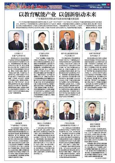 2025年是落实教育强国建设规划纲要的关键之年,也是“十四五”收官和“十五五”谋划之年,更是面向十年建成教育强国全面布局、高位推进之年。新年伊始,广东省高质量发展大会聚焦“建设现代化产业体系”,擘画新一年高质量发展图景;全省教育大会亦强调以教育之强支撑广东发展由大向强,系统推进高技能人才培养;全国两会提出坚持创新引领发展,一体推进教育发展、科技创新、人才培养……广东教育界积极响应,多所高职院校的领航者结合学校特色与发展目标,围绕人才培养、科技创新、服务区域等方向,共绘教育高质量发展蓝图。