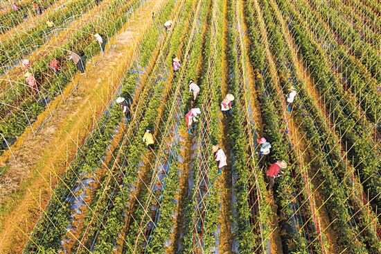 工作队进驻后,联合相关部门专家多次考察走访,发现界炮镇拥有大片富硒红土壤适合圣女果生长。“2019年,圣女果作为新兴产业被引入遂溪,但由于种植成本较高,始终未能做大做强。”中交广航局驻村第一书记李小佳说。于是,工作队通过惠农贷款政策,帮助100余农户贷款2700余万元用以扩大种植经营。同时,工作队联系广东省农业技术推广中心科研部门等领衔科技团队“把脉问诊”,邀请技术骨干开展“田间小课堂”和直播授课,针对性地解决农户种植遇到的各种难题。率先建立圣女果生产基地的界炮镇江头村从2019年试种300亩发展到2022年的2000亩规模种植,年度产业总收入超1亿元,成为“亿元村”。
