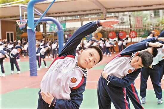广州市番禺区东湖州小学课间活动开展八段锦、眼保健操,帮助学生缓解用眼疲劳,强健体魄,还创意融入粤韵操,让学生在富有岭南文化特色的韵律中锻炼身体。