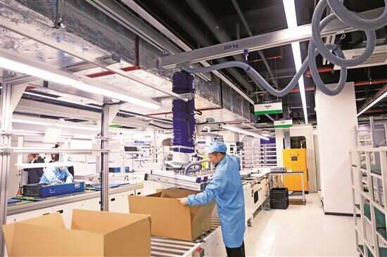 ▲高新兴智能制造综合产业园的10万级无尘洁净恒温恒湿制造车间可实现自动化生产,配备进口高速贴片设备,4组全自动化测试环可实现模块300万片的年产能。