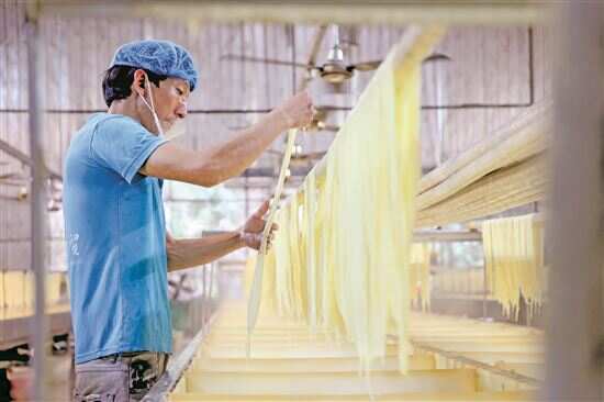 ■在热气腾腾的腐竹生产车间,一位工人正从蒸锅里将成形的腐竹拉起、晾晒、整理。