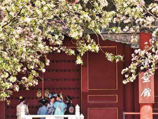 ■春日故宫,繁花似锦,游客身着清装拍照。