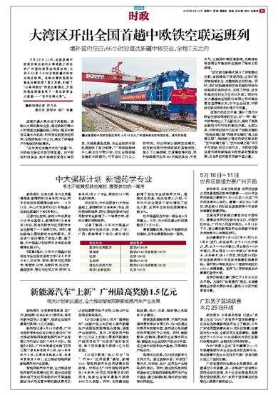 4月18日11时,全国首趟中欧铁空联运班列从粤港澳大湾区的广州国际港货站鸣笛启程,它将于60多个小时后到新疆中转空运抵达欧洲。这标志着我国国际物流运输取得了重大突破,打破了“公路转航空”传统运输模式,为国际物流领域拓展了一条全新黄金大通道——“空中丝绸之路”。