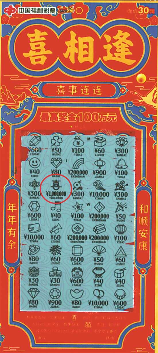 据介绍,“喜相逢”即开票游戏名称取团圆、美满之意,玩法简单,即开即兑。刮开覆盖膜,如果刮出“喜”图符,即可获得该图符下方所对应的奖金;如果刮出“囍”图符,即可获得该图符下方所对应奖金的两倍。中奖奖金兼中兼得。“喜”与“囍”的中奖图符设计,再次呼应“喜相逢”主题,传递相逢甚喜、喜事成双的美好寓意,上市以来受到广大购彩者的青睐。