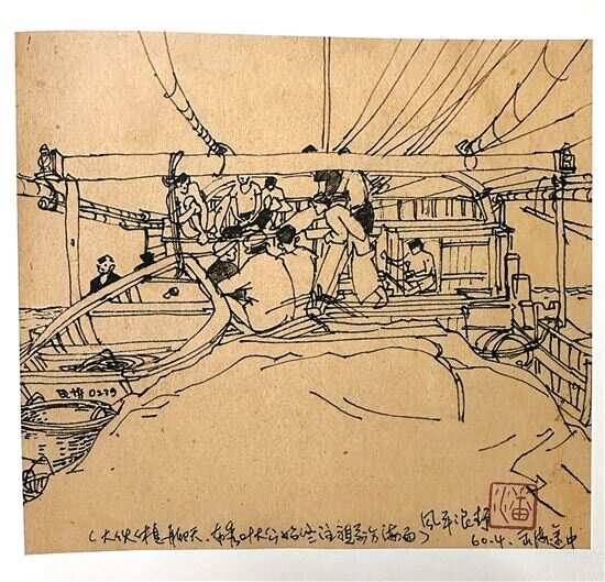 我的速写,大部分画于有一定生活基础的情境中。无论是珠三角水乡、南国渔港、椰乡、海港、工厂、部队……在与表现对象共同生活的过程中,我获得了全方位、多层次的感受。有了这样一种认知基础,任何引起作画冲动的就不仅仅是瞬间的表象而能够与总体认知相联系。