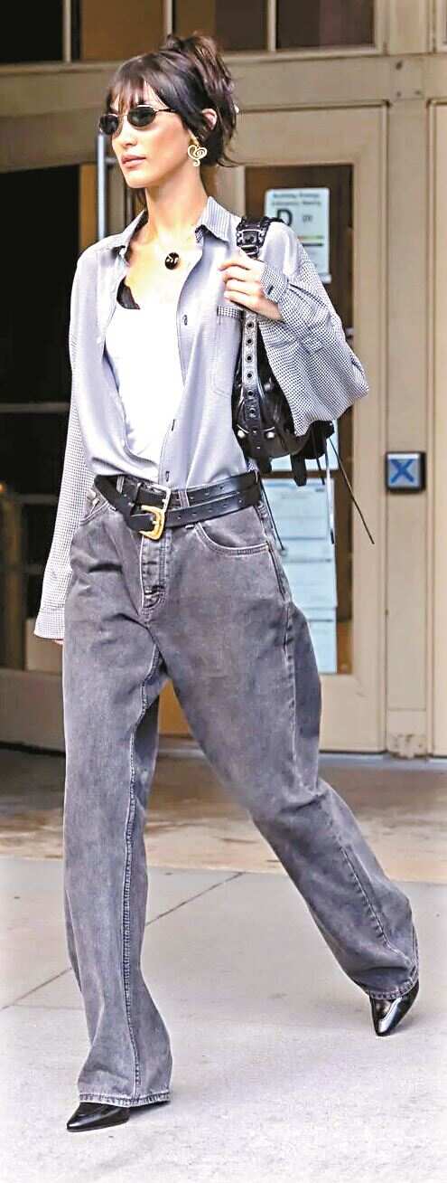 灰色阔腿牛仔常与西装外套碰撞出“刚柔并济”的火花,垫肩西装平衡宽松裤型的拖沓感,腰带加持即刻勾勒腰线,优化身材比例;休闲场景可随意套上基础白T或白背心,露出脚踝的九分长度适配老爹鞋或穆勒鞋,实现“慵懒不邋遢”的穿搭平衡。喜欢夸张廓形的时髦精还可尝试“茧”型牛仔裤,从微正式场合到休闲日常,其独有的宽松曲线将随意悠闲感与前卫特质巧妙融合。
