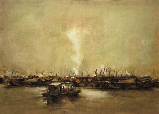 郑来喜创作之初以他最熟悉的家乡海边与乡村的风景入画,宏大宽阔的海面、远近不一的船帆桅杆、高低错落的房屋与街道……画面强烈的节奏天然地符合地平线构图。艺术家对乡村的眷恋在步入广州这座大都市后转向珠江两岸的城市景象,对风景的描绘范畴从乡村风景拓宽至城市景观。而这种通常适用于风景的图式运用于人物绘画时产生了独特的空间感,同时,其捕捉到人群的疏密排布与风景的高低远近构成某种节奏与形式上的共鸣,继续将自我创作的个性化图式进行拓宽。