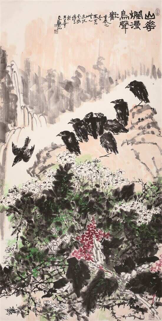 因此,吴静山的大写意花鸟综合了近代花鸟画家的手法,张大千、潘天寿,乃至明代徐渭、八大。他曾言,以方人定的写实、潘天寿苍劲用笔、独特的构图等做基础,“学习齐白石大写意的随意;吴昌硕以书入画的苍辣笔法;蒲作英极好的墨法;赵之谦继承任熊、任熏的传统。”