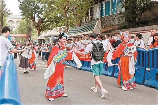 “文曲星”送考是广州市第六中学考点高考的“传统节目”。高考首日,六中高一的学弟学妹们会组成送考团,或扮成“文曲星”,在入口迎接考生们的到来,与考生击掌传递好运,或在道路两旁为考生呐喊助威。