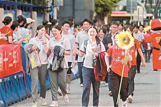送考现场充满仪式感,不少家长精心打扮,为奔赴考场的孩子“博彩头”,有的穿上红色裙子、旗袍,寓意“旗开得胜”;有的身着印有“顺”字的紫红色衣服,希望孩子考试顺利。广州外国语学校门口,一抹抹亮丽的“送考红”格外耀眼,校领导、老师、家长们身着喜庆红衣,化身“最强应援团”,与每一位学子击掌、拥抱,送上最灿烂的笑容和最响亮的祝福:“加油!必胜!”