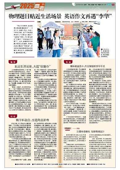 “作文又有李华,这次他要为英语报增设栏目”……6月8日,物理、历史、外语三个科目开考。在下午的英语考试中,广东考生又遇见了“老朋友”李华,不少考生表示“不意外”,“没有他还不习惯了”。此外,物理科目今年题目贴近生活场景,有考生反映大题设计“很复杂”,历史科目则涉及跨学科知识的融合,考生认为:出题角度新奇,整体难度中等。